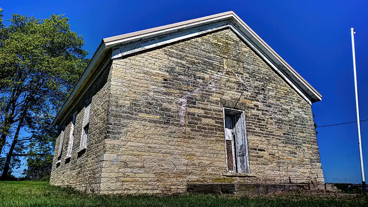 Central School, also known as Hickory Grove School, is a historic one-room schoolhouse located northeast of Canton, Iowa, United States. It is one of over 217 limestone structures in Jackson County from the mid-19th century, of which 12 are school buildings. This school building was built in 1868, possibly by G.W. Kelsall or Issac Wilmer McCullogh, who were local stonemasons. The stone blocks that were used in the construction of this rectangular structure vary somewhat in shape and size, and they were laid in courses. What is unusual about the stone used here is that they are long and narrow, compared to the other buildings. with The stones used at the corners are somewhat larger. The window sills and lintels are dressed stone. The stone used for this building was quarried about a mile north of here. A name and date stone are located on the east gable, above the door. The building was listed on the National Register of Historic Places in 1992. Read more on Wikipedia