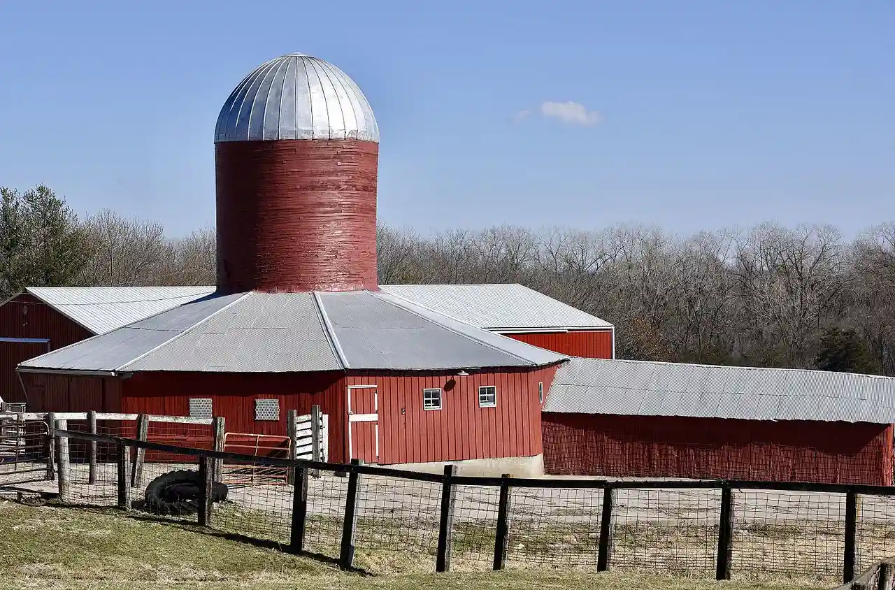 The Dyas Hexagonal Barn is a historical building located near Bellevue in rural Jackson County, Iowa, United States. Built in 1921, it is a round barn measuring around, with red horizontal siding on a stone foundation, a tin roof, and a central wood stave silo extending through the roof. Despite the common name, the building is actually eight-sided, and is also known as the Dyas Octagonal Barn. Originally the roof was flat or almost flat; it is one of four round barns known to have been built on the same farm. with It has been listed on the National Register of Historic Places since 1986. Read more on Wikipedia