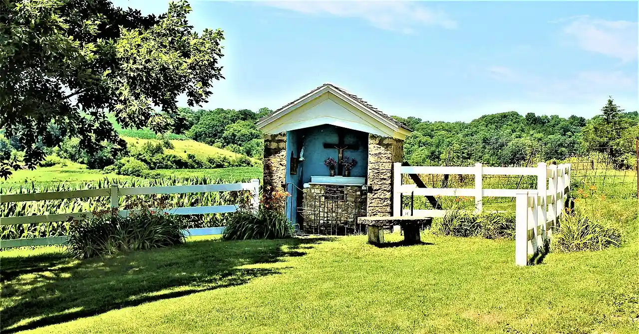 Fritz Chapel is a historic religious structure located northwest of Bellevue, Iowa, United States. The small roadside chapel was built by Mathias Fritz (1819-1889) in 1852. Fritz immigrated with his family to the United States from Luxembourg that same year. He built this chapel as an act of thanksgiving for the safe journey. The roughly structure has limestone walls on three sides and is open on the front. with It is capped with a gable roof. The walls inside the chapel are plastered, and it houses a small stone altar and a hand-carved crucifix. Located on the north side of a gravel road, it is surrounded by a picket fence. It was listed on the National Register of Historic Places in 1991. Read more on Wikipedia