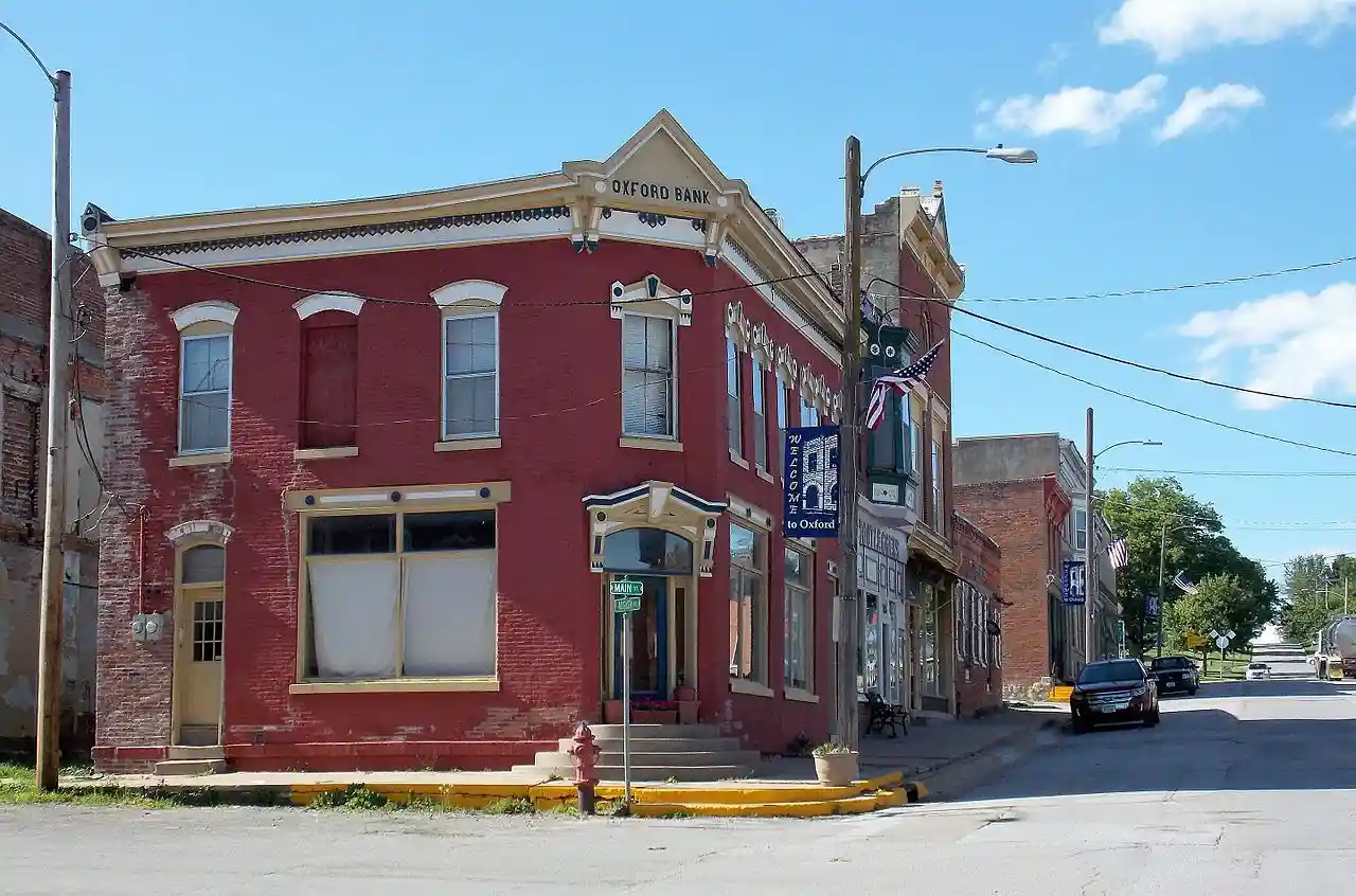 The Oxford Commercial Historic District is a nationally recognized historic district located in Oxford, Iowa, United States. It was listed on the National Register of Historic Places in 1997. At the time of its nomination it consisted of 20 resources, which included 16 contributing buildings and four non-contributing buildings. with This district reflects a typical central business district found in a Midwest town. It represents a transitional period from a frontier town to a settled community, and from the horse as the primary means of transportation to the automobile and mechanized farming. Most of the buildings in Oxford's business district were constructed between 1883 and 1917. Some replaced the wood-frame structures from the town's frontier days, while others replaced those destroyed by a major fire that consumed the north side of the district in 1890. They are one to two stories in height, and their exteriors are composed of common brick. While simple in composition, many feature ornate decorative cornices. The Italianate and Romanesque Revival styles dominate. Read more on Wikipedia
