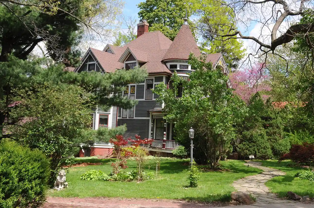 The Woodlawn Historic District is a nationally recognized historic district located in Iowa City, Iowa, United States. It was listed on the National Register of Historic Places in 1979. At the time of its nomination it consisted of 14 resources, all of which are contributing buildings. with The district is largely on Woodlawn Street, a gravel dead-end extension of Iowa Avenue. The eastern terminus of Iowa Avenue was originally planned to be a block to the west and was to be the location of the Governor's Mansion, but it was never built. The Old Capitol is on western terminus of the same street. The district is an enclave of upper-middle-class houses on Woodlawn and Evans Streets. Nine of the houses were built in the late 19th century, two were built in the 1920s, and two were built in mid-20th century. There is also a four-story Tudor Revival apartment building on Evans Street that was built in 1926. All of the buildings are located on deep set-backs on large landscaped lots that provide seclusion and cohesion, which is what gives them their significance. The most prominent house is a Queen Anne style home at 1036 Woodlawn Street. Read more on Wikipedia