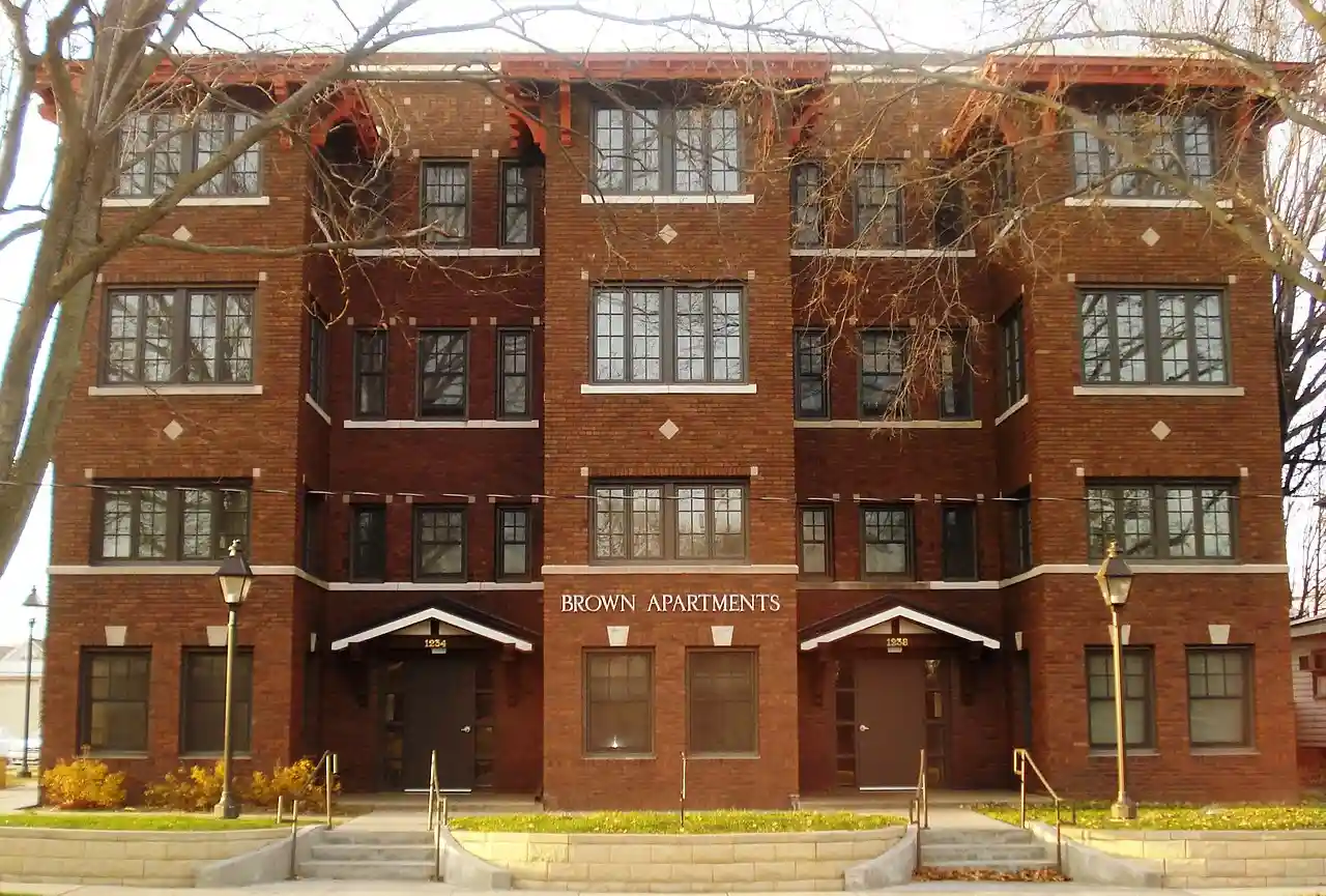 Brown Apartments is a historic building located in Cedar Rapids, Iowa, United States. Designed by local architect William J. Brown, this is an early example of an apartment suites building type and the first known English basement apartment building in the city. Other innovations from the time of construction include the janitor's living quarters, a common laundry room, and tenant storage areas. The building's first owners were Arthur and Elizabeth Brown. He was an ice cream manufacturer and marketer, and it is unknown if he was related to the architect. The four-story, brick structure features American Craftsman influences. The symmetrical facade consists of three projecting solarium bays between which are the entry ways into the building. Both of the entry porches has heavy wooden brackets, and each bay is capped with distinctive wood parapets that are supported by heavy timber brackets. Regionalist painter Marvin Cone lived in the building from 1920 to 1923. He dedicated two oil paintings to the Browns in lieu of rent. The building was listed on the National Register of Historic Places in 2010. Read more on Wikipedia