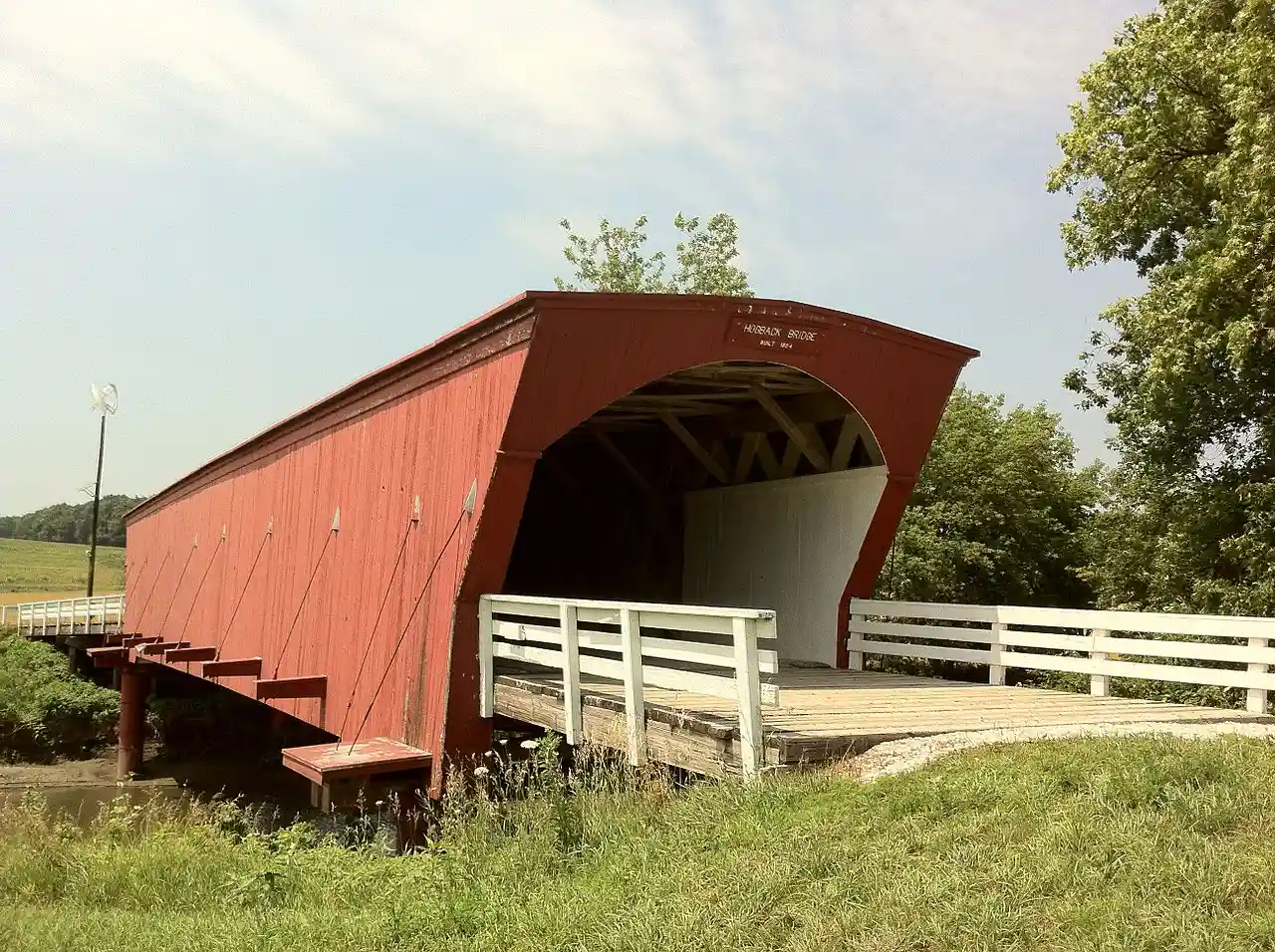 The Hogback Covered Bridge is a historic covered bridge near Winterset, Iowa. Named after a nearby limestone ridge, it was built in 1884 by Harvey P. Jones and George K. Foster over the North River on Douglas Township Road. The bridge was designed with a Town lattice truss system. It was built with steel pylons to support the main span. Read more on Wikipedia