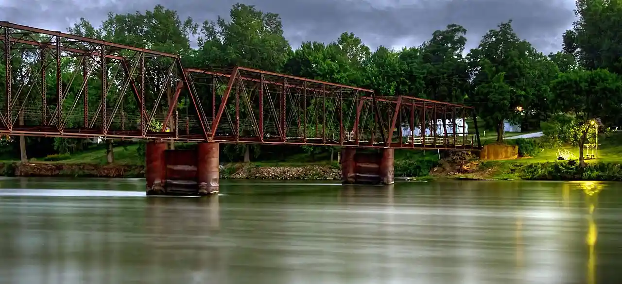 Bellefountain Bridge is located east of Tracy, Iowa, United States. It carried traffic of Ashland Avenue over the Des Moines River for . In 1898 the Mahaska Board of Supervisors contracted with the Clinton Bridge Company of Clinton, Iowa to design and build a new bridge for $9,750. It replaced a ferry service that operated in the small town of Bellefountain. The Pratt through truss span was completed in 1898. Its deck has subsequently deteriorated and the bridge has been closed to traffic. The bridge was listed on the National Register of Historic Places in 1998. Read more on Wikipedia