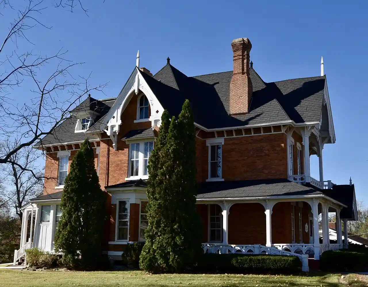 The T.B. Perry House is a historical residence located in Albia, Iowa, United States. Theodore Perry was a local attorney and businessman who served two terms in the Iowa Senate. He is also responsible for a couple of buildings in the Albia Square and Central Commercial Historic District. This house is a High Victorian eclectic style structure. It is one of four large brick houses in Albia known as the Four Sisters. They all feature a running brick bond on their exterior walls. It is an unusual architectural feature for southern Iowa in the period they were built, and it also suggests they have the same architect and/or brick mason. The Elbert-Bates House is another house in this group. The Perry house was designed by Charles A. Dunham from the prominent Burlington, Iowa architectural firm of Dunham & Jordan. It is noteworthy for its elaborate roofing system. It features five dormer windows, two hip-and-deck roofs, three gable roofs, and two hipped roofs. The steeply pitched roof also has finials, pendants, and brackets with a modified frieze under the eaves. Other elements of the richly ornamented exterior include barge boards on the second story and entry gables, and a front porch with Gothic tracery millwork. The house was listed on the National Register of Historic Places in 1983. Read more on Wikipedia