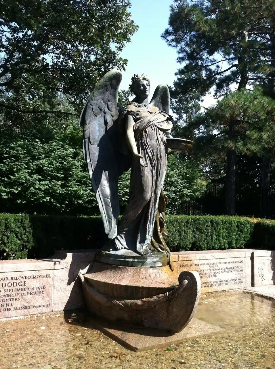 The Ruth Anne Dodge Memorial, also known as the Black Angel, is a historic object located in Council Bluffs, Iowa, United States. This is the only work in Iowa by the American sculptor Daniel Chester French. with The cast bronze sculpture stands along the edge of Fairview Cemetery as a tribute to Ruth Anne Dodge, the wife of railroad magnate Grenville M. Dodge. The tall angel holds a water basin and is wreathed in laurel. Its pedestal is a representation of a ship's prow with a garland swag, carved in pink marble. The pedestal, platform and reflecting pool are the work of New York architect Henry Bacon. The work was commissioned by Dodge's daughters Anne Dodge and Ella Dodge Pusey. It represents a recurring dream their mother had as she was dying of cancer. An angel with a bowl of water approached her and urged her to drink. During the third occurrence of the dream Mrs. Dodge took a drink and she died not long after. The sculpture was individually listed on the National Register of Historic Places in 1980. In 2007 it was included as a contributing property in the Lincoln-Fairview Historic District. Read more on Wikipedia