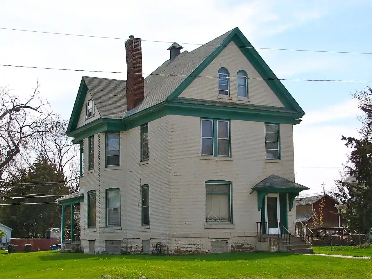 The Elizabeth Pohlmann House is a historic building located in the West End of Davenport, Iowa, United States. Elizabeth Pohlmann was the widow of Herman B. Pohlmann, and she had this house built in 1896. The Pohlmann's were part of the German-ethnic community that lived on the northwest side of Davenport. The house features the hip roof and gable projections typically found in the Queen Anne style. But it also includes full cornice returns, which create pediments, and light colored brick typical of the Colonial Revival style. with The 2½-story residence also features a main entrance framed by sidelights and an art glass transom over a plate glass parlor window. Both the front and the back of the house are missing prominent porches that were originally part of the structure. It has been listed on the National Register of Historic Places since 1984. Read more on Wikipedia
