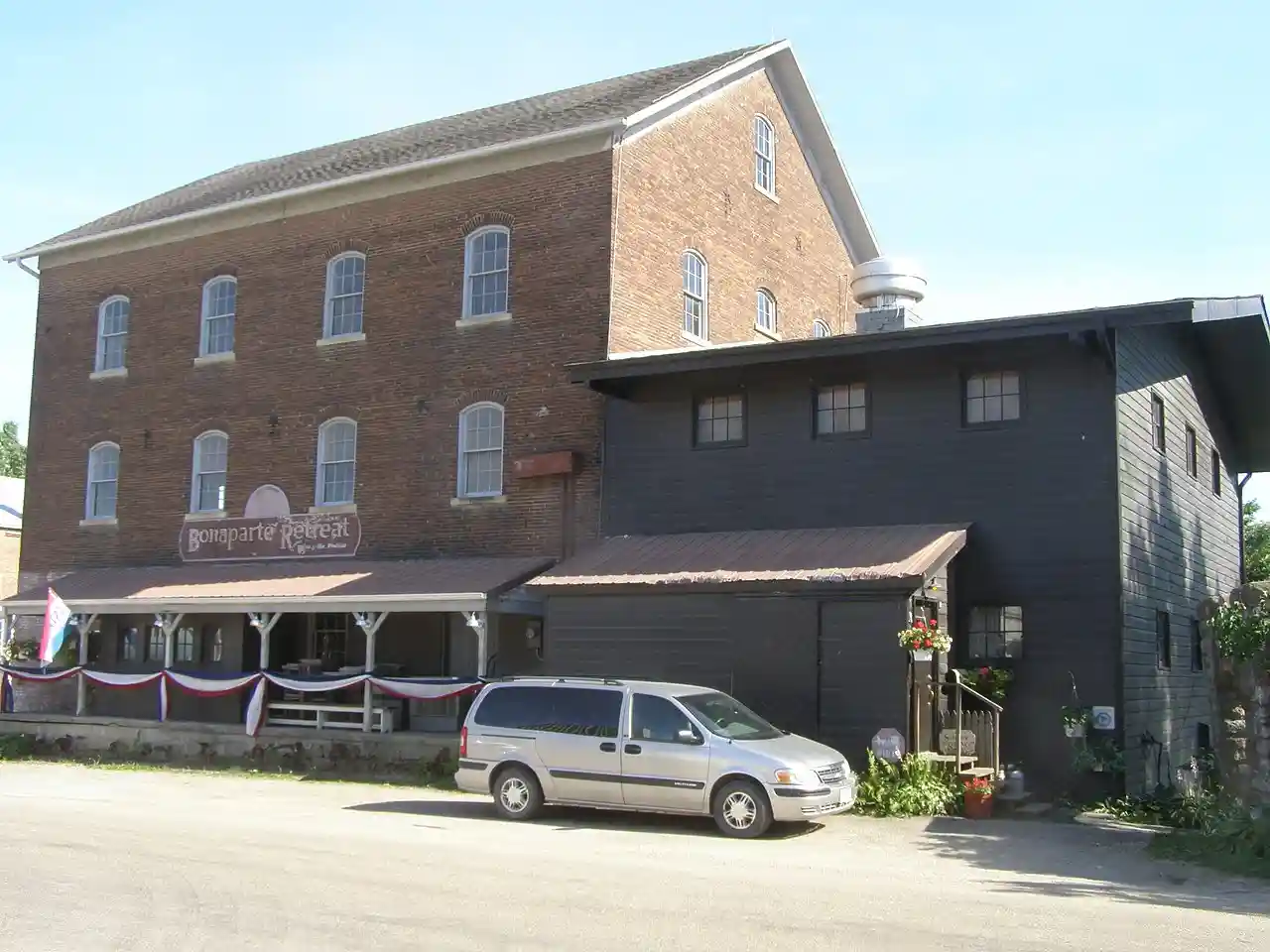 Meek's Flour Mill is a historic building located in Bonaparte, Iowa, United States. William Meek and Dr. R.N. Cresap laid out the town of Meek's Mill in 1837. Although the town was renamed Bonaparte in 1841, the Meek family had a central role in its development through the turn of the 20th-century. with The present building is a three-story, gable roofed, rectangular structure that was built on a raised basement of ashlar limestone blocks. It was constructed in 1878 by William's son Robert, who had succeeded his father in running the family businesses. He was assisted by his brothers Isaiah and Joseph. It replaced the original 1844 mill, which had been destroyed in a fire. While built on the same site, it is unknown if any part of the present structure was a part of the original mill. Two other structures belonging to the Meek's family are located nearby: a woolen mill (1853), and a saw mill (1860). Read more on Wikipedia