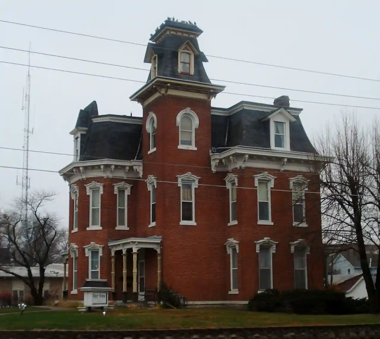 The Blair House of Washington, Iowa, formerly used as the town's City Hall, was built in 1881. It was listed on the National Register of Historic Places in 1973. The building has served several different functions in its history. with It was built as a private residence by a local financier and realtor Winfield Smouse. The Blair family lived here from 1882 to 1891, followed by C.J. Wilson. It then housed the Commercial Club from 1903 to 1926 and they added a gymnasium and club rooms on the south side. The building housed the Washington City Hall from 1926 to 1972. They added a larger front porch, a fire station to the east side of the house and hung the fire bell in the tower. It is one of the few Victorian houses that remains in this area. The 2½ story structure follows an irregular plan. Its exterior is composed of brick and both the main block and the tower are capped with a mansard roof. Des Moines architect William Wagner said the Blair House is a "little gem-a miniature Terrace Hill", a reference to the present Iowa Governor's Mansion. Read more on Wikipedia