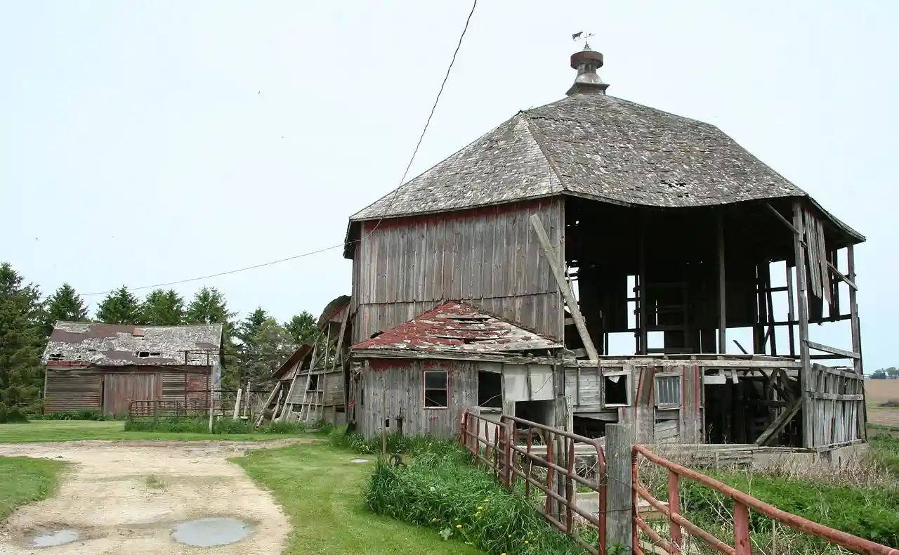 The Kinney Octagon Barn was a historic agricultural building located just north of Burr Oak, Iowa, United States. Lorenzo Coffin was a stock breeder and the farm editor of the Fort Dodge Messenger. He is thought to have built the first round barn in Iowa in 1867. with The modified hip roof and heavy timber construction of this barn, built in 1880, suggests that it was a Coffin-type octagon barn. It was added to the National Register of Historic Places on November 19, 1986. It has subsequently been torn down. Read more on Wikipedia