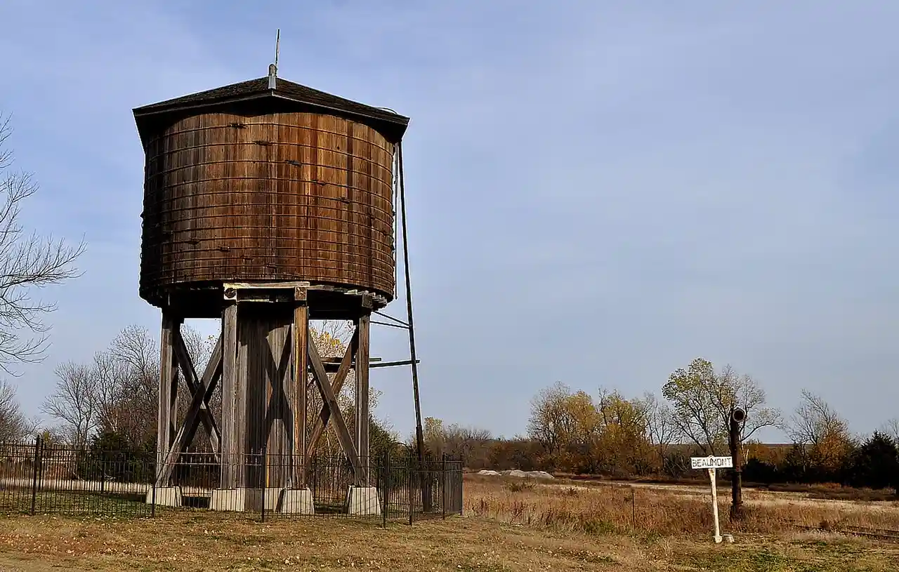 The Beaumont St. Louis and San Francisco Railroad Water Tank is a railroad water tank or water tower constructed in 1875, in Beaumont, Kansas. It served the St. Louis, Wichita & Western Railway, and was used to refill the boilers of steam locomotives on that line. It was added to the National Register of Historic Places in 1993. A sign at the site claims it was the last water tank used in regular railway operations in the United States. Read more on Wikipedia