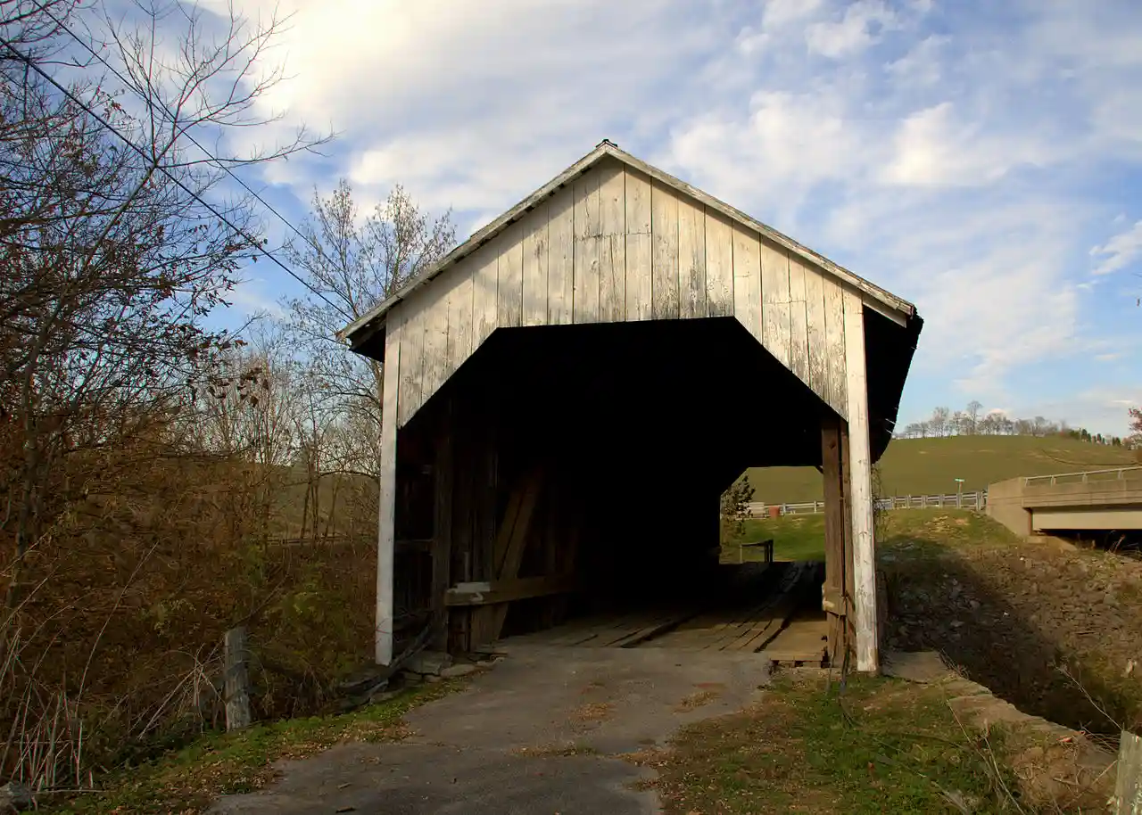 The Hillsboro Covered Bridge, known locally as the "Hillsboro-Grange City Covered Bridge", spans Fox Creek in Fleming County adjacent to Kentucky Route 111, southeast of Flemingsburg, Kentucky. Probably built in the late 1860s, it was discontinued in 1968 when it was replaced upstream by a concrete bridge. Read more on Wikipedia