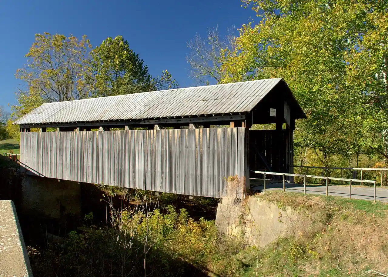 The Ringos Mill Covered Bridge spans Fox Creek in Fleming County, Kentucky, in a single 90-foot span. It was named for a grist mill situated 50 yards downstream. Read more on Wikipedia