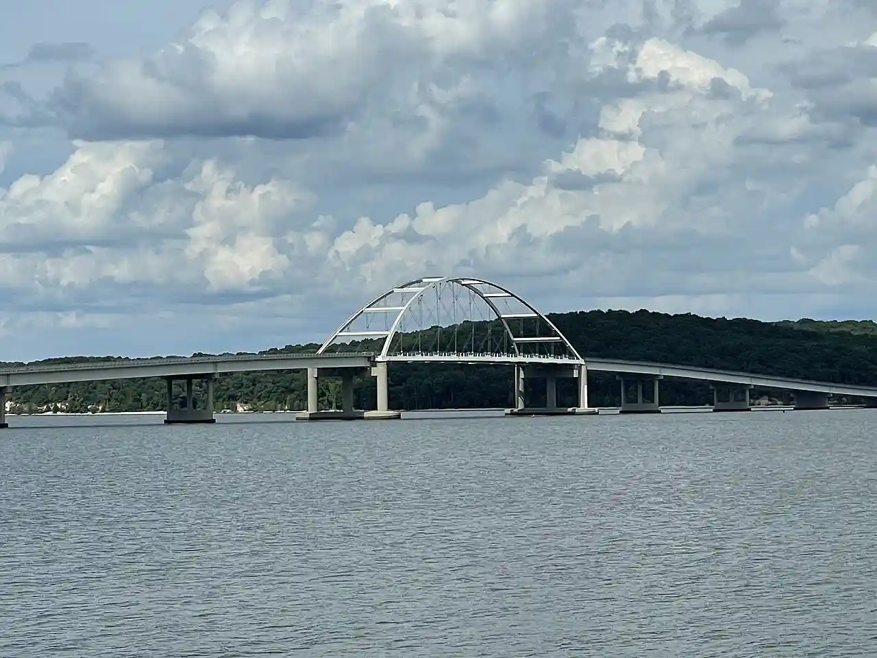 Eggner Ferry Bridge, also known as Eggner's Ferry Bridge, is a four-lane bridge in Trigg and Marshall counties in the U.S. state of Kentucky. The current through-arch bridge opened to traffic on April 7, 2016, replacing a two-lane bowstring truss bridge constructed in 1932. The bridge carries US 68 and Kentucky Route 80 across Kentucky Lake. The main span of the original 1932 bridge collapsed on January 26, 2012, after it was hit by a ship. There were no injuries. The bridge was repaired and reopened to traffic on May 25 of that year. On the morning of July 25, 2016, the middle four spans of the old Eggner's Ferry Bridge were brought down using controlled explosives. Read more on Wikipedia