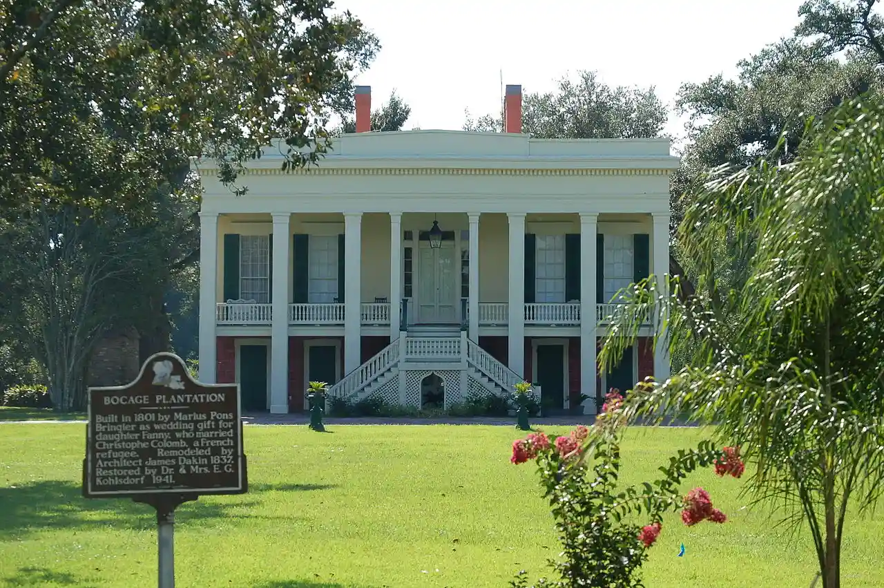 Bocage Plantation is a historic plantation in Darrow, Ascension Parish, Louisiana, about southeast of Baton Rouge. The plantation house was constructed in 1837 in Greek Revival style with Creole influences, especially in the floorplan. Established in 1801, the plantation was added to the National Register of Historic Places on June 20, 1991. Read more on Wikipedia