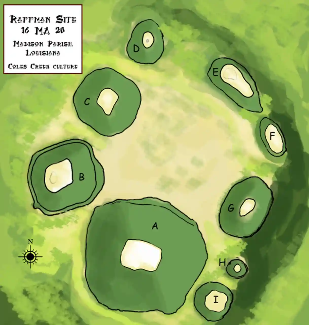 The Raffman site ( 16 MA 20 ) is an archaeological site located in Madison Parish, Louisiana and constructed between 700 and 1200 CE. It has components from the Tchefuncte culture and the Coles Creek culture, whose main period of occupation was during the Balmoral phase (1000-1100 CE) of the Tensas Basin and Natchez Bluffs chronology and which was virtually deserted by the end of the Preston phase (1100–1200 CE). Read more on Wikipedia