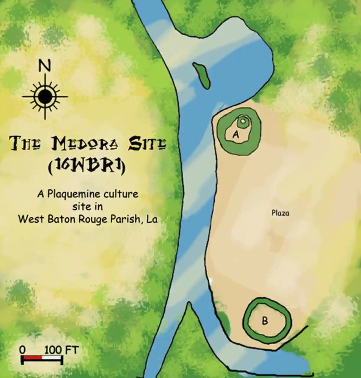 The Medora site (16WBR1) is an archaeological site that is a type site for the prehistoric Plaquemine culture period. The name for the culture is taken from the proximity of Medora to the town of Plaquemine, Louisiana. The site is in West Baton Rouge Parish, Louisiana, and was inhabited from approximately 1300 to 1600 CE. It consisted of two mounds separated by a plaza. In the winter of 1939-40 excavation of this site was undertaken by the Louisiana State Archaeological Survey, a joint project of Louisiana State University and the Work Projects Administration. It was directed by James A. Ford, and George I. Quimby. The excavations of the site were instrumental in defining the characteristics of the Plaquemine period and culture. Read more on Wikipedia