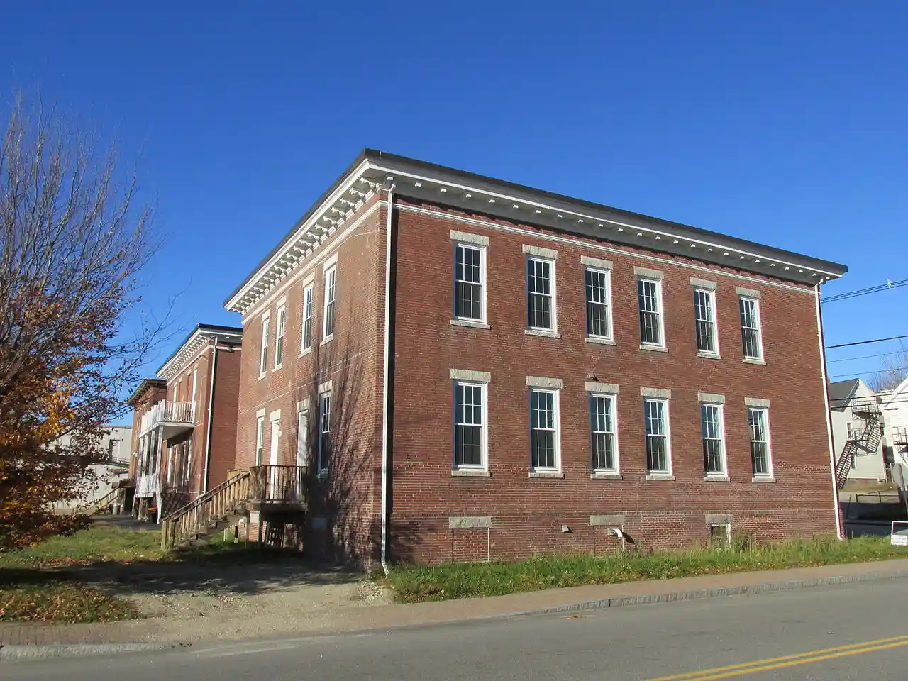 The Androscoggin Mill Block is an historic tenement house at 269-271 Park Street in Lewiston, Maine, United States. The two-story brick building was one of several built in 1866 by the Androscoggin Mill Company to provide housing for workers with families, and is one of only three such 19th-century buildings to survive in the city. The building was listed on the National Register of Historic Places in 2001. Read more on Wikipedia