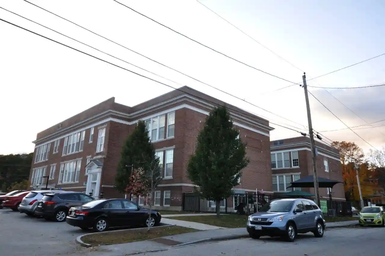 The Webster Grammar School is an historic former school building at 95 Hampshire Street in Auburn, Maine. Built in 1915-16 to a design by Harry S. Coombs, it was one of the first junior high school buildings in New England, and is a fine local example of Colonial Revival architecture. The building is now apartments and a community center, and was added to the National Register of Historic Places in September 2010. Read more on Wikipedia