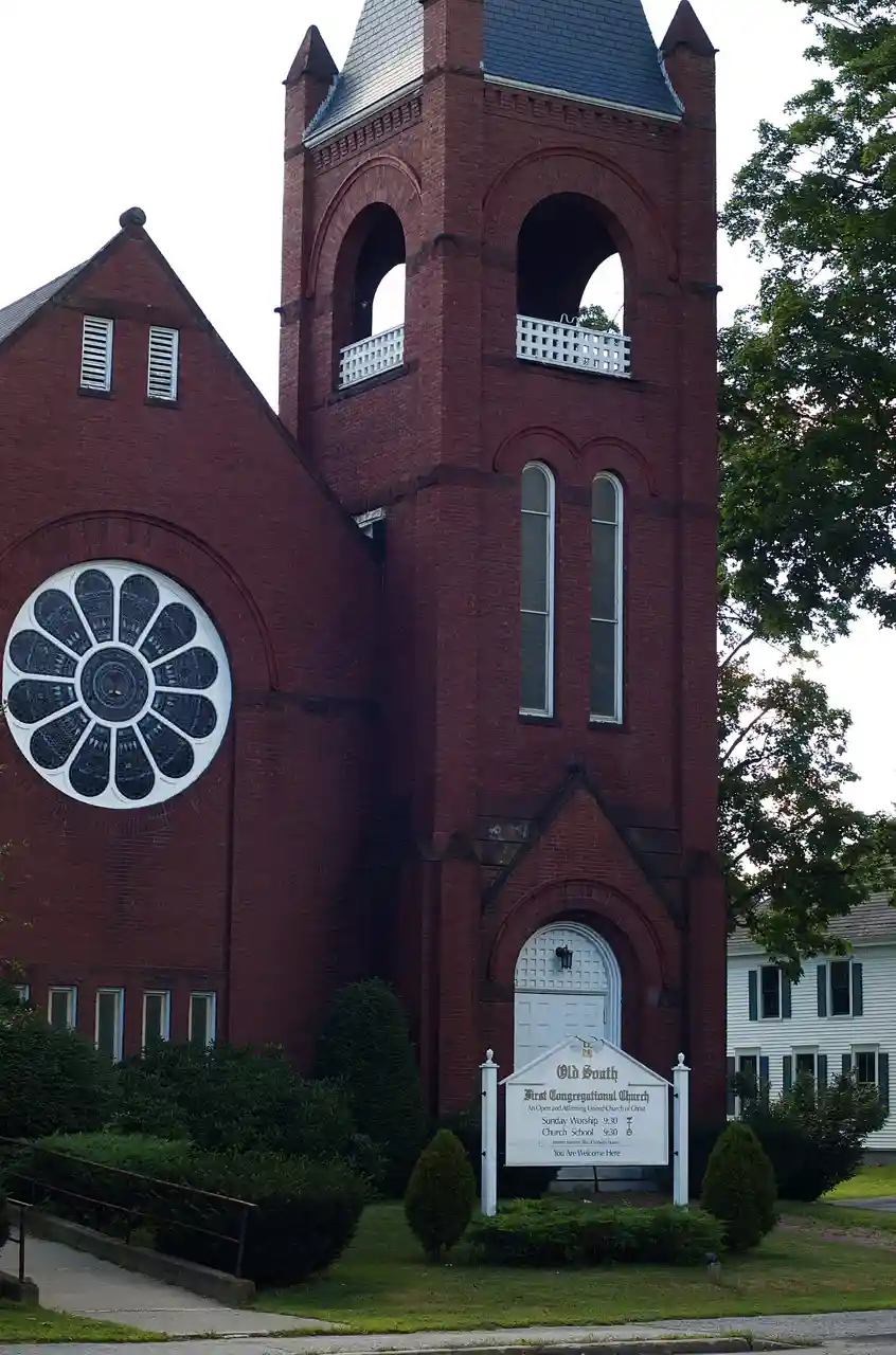 The First Congregational Church, United Church of Christ, also known as the New Old South Congregational Church, is a historic church at 235 Main Street in Farmington, Maine. The congregation's present sanctuary is a brick Romanesque structure designed by George M. Coombs and was completed in 1887. It is the town's finest 19th-century church, and one of the most architecturally sophisticated in the region. It was listed on the National Register of Historic Places in 1974. The congregation, established in 1814, celebrated its 200th anniversary in 2014. Read more on Wikipedia