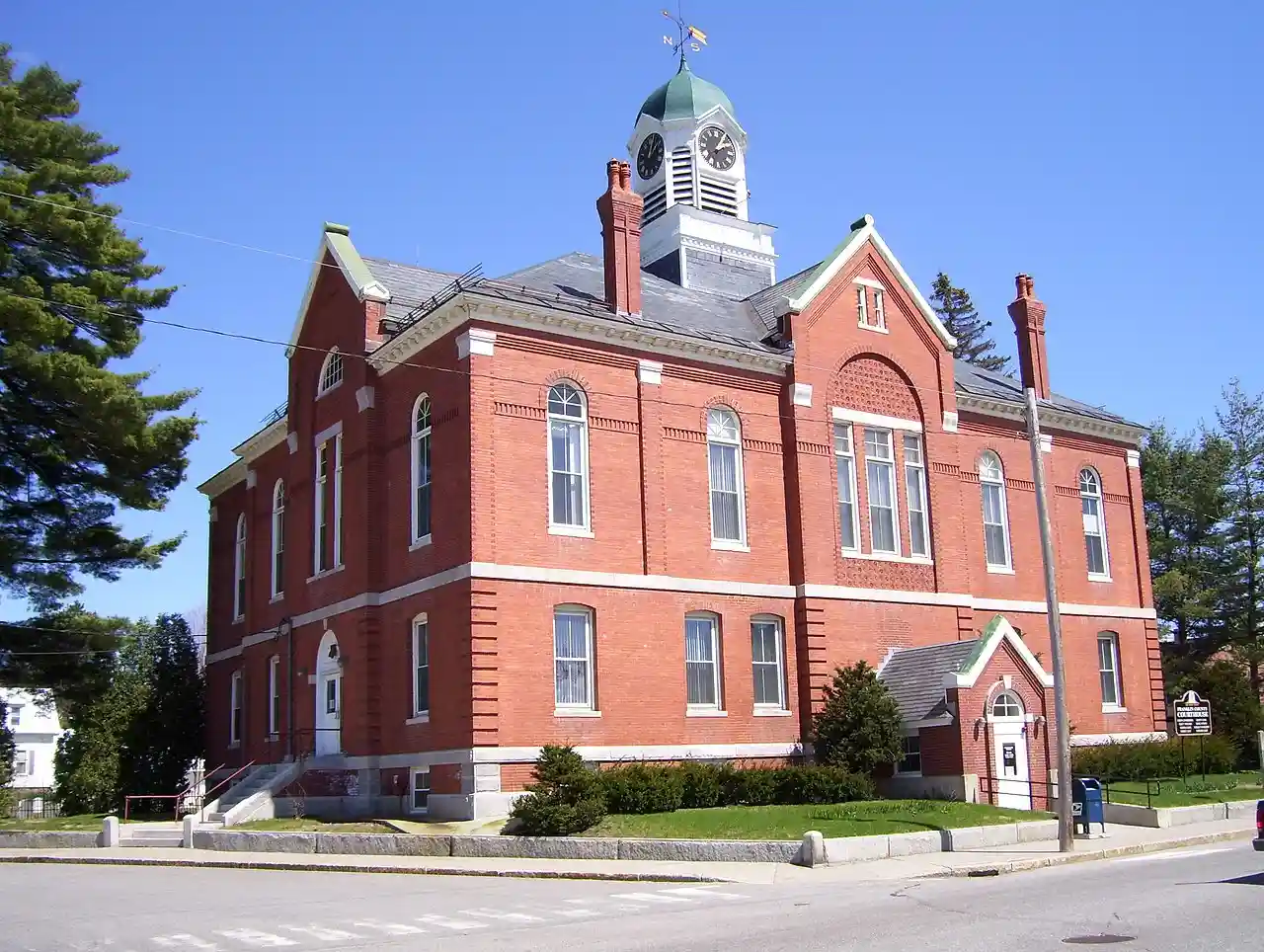 The Franklin County Courthouse is a courthouse located in Farmington, Maine, the county seat of Franklin County. The 1885 courthouse represents a sophisticated design by George M. Coombs, with an addition in 1917 by Coombs' son, Harry Coombs. The building, the county's first purpose-built courthouse, was listed on the National Register of Historic Places in 1983. Read more on Wikipedia