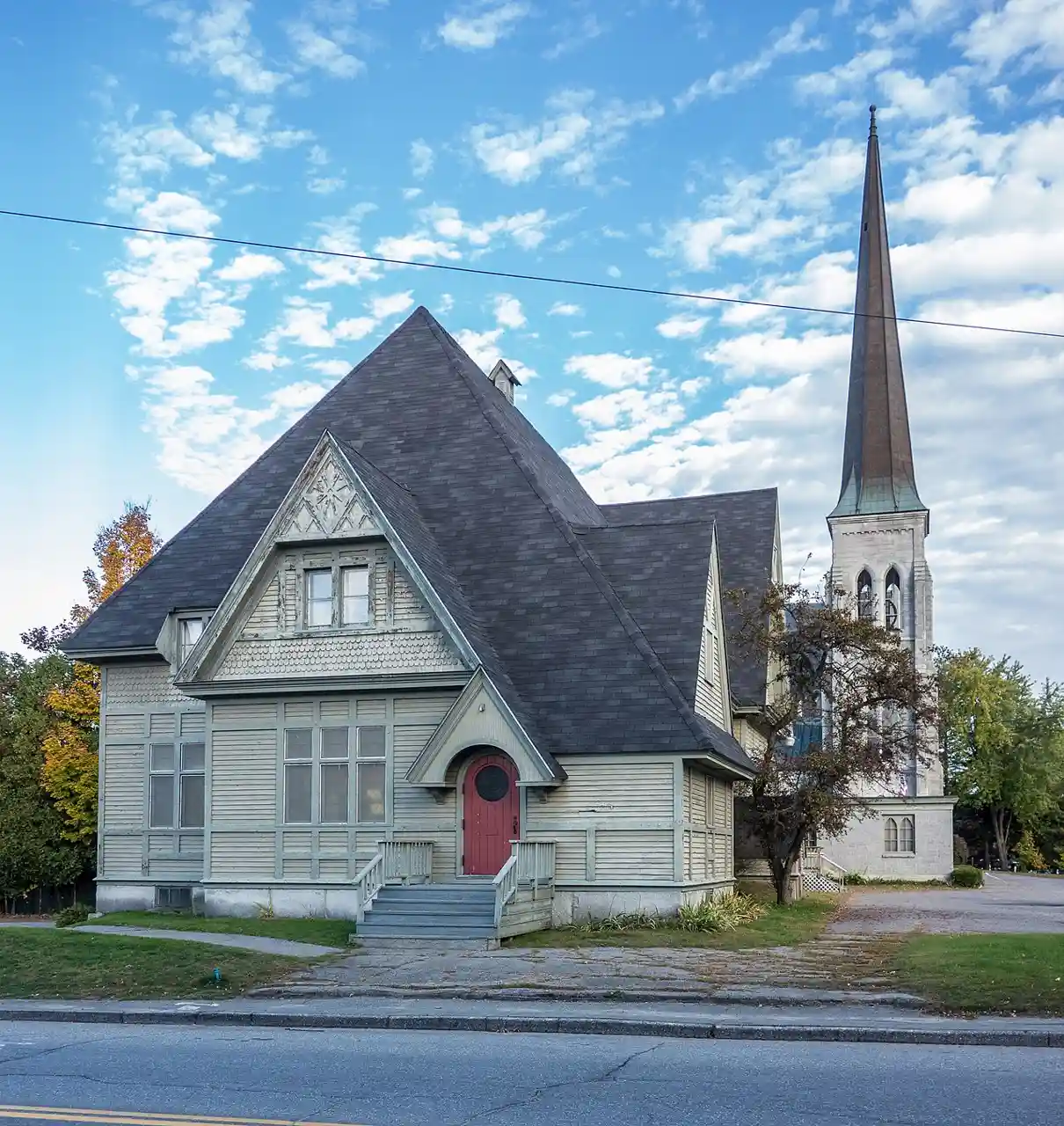 The South Parish Congregational Church and Parish House is a historic church at 9 Church Street in Augusta, Maine. Built in 1865, the church is a major Gothic Revival work of Maine's leading mid-19th century architect, Francis H. Fassett, and its 1889 parish house, designed by James H. Cochrane, is a rare example in the state of Stick style architecture. The property was listed on the National Register of Historic Places in 1980. The congregation was established in 1773, when the area was part of Hallowell. Read more on Wikipedia
