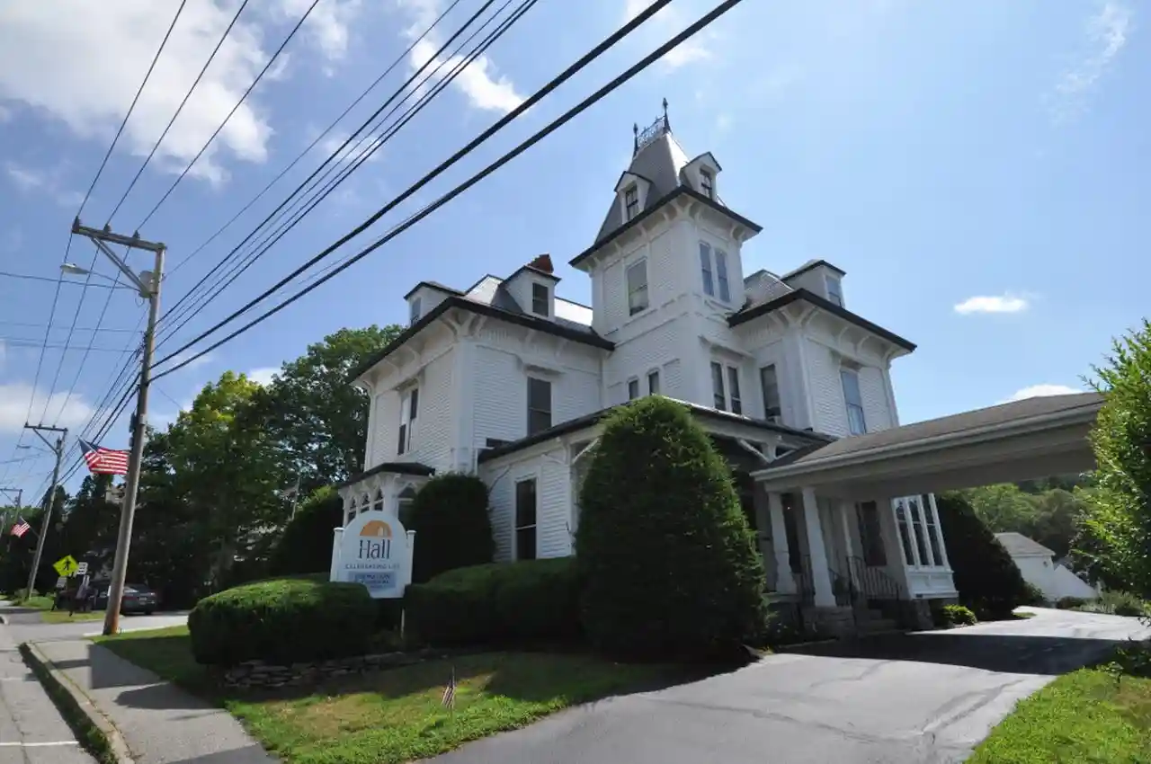 The Hutchins House is a historic house at 949 Main Street in Waldoboro, Maine. Built in 1879 for the widow of a successful ship's captain and shipbuilder, it is an elaborately decorated example of Second Empire architecture with Stick style features. It was listed on the National Register of Historic Places in 1982; it presently houses a funeral home. Read more on Wikipedia