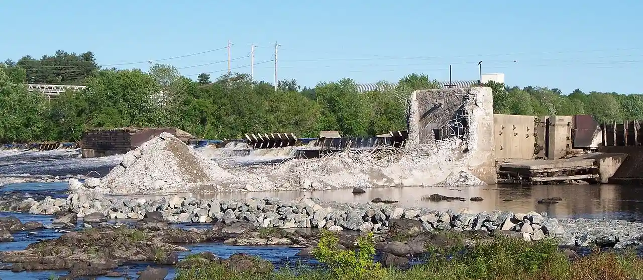 The Great Works Dam was a dam on the Penobscot River between Old Town and Bradley in Penobscot County, Maine, USA. The original Great Works Dam was constructed in the 1830s and replaced between 1887 and 1900. The dam was originally owned by the Penobscot Chemical Fibre Company and was acquired by Diamond International Corporation in 1968 along with the adjacent mill. The dam and powerhouse were sold several more times, and in 2010 the Penobscot River Restoration Trust bought the dam from PPL Corporation based on an agreement that was signed in 2004. On June 11, 2012, deconstruction of the dam began Read more on Wikipedia