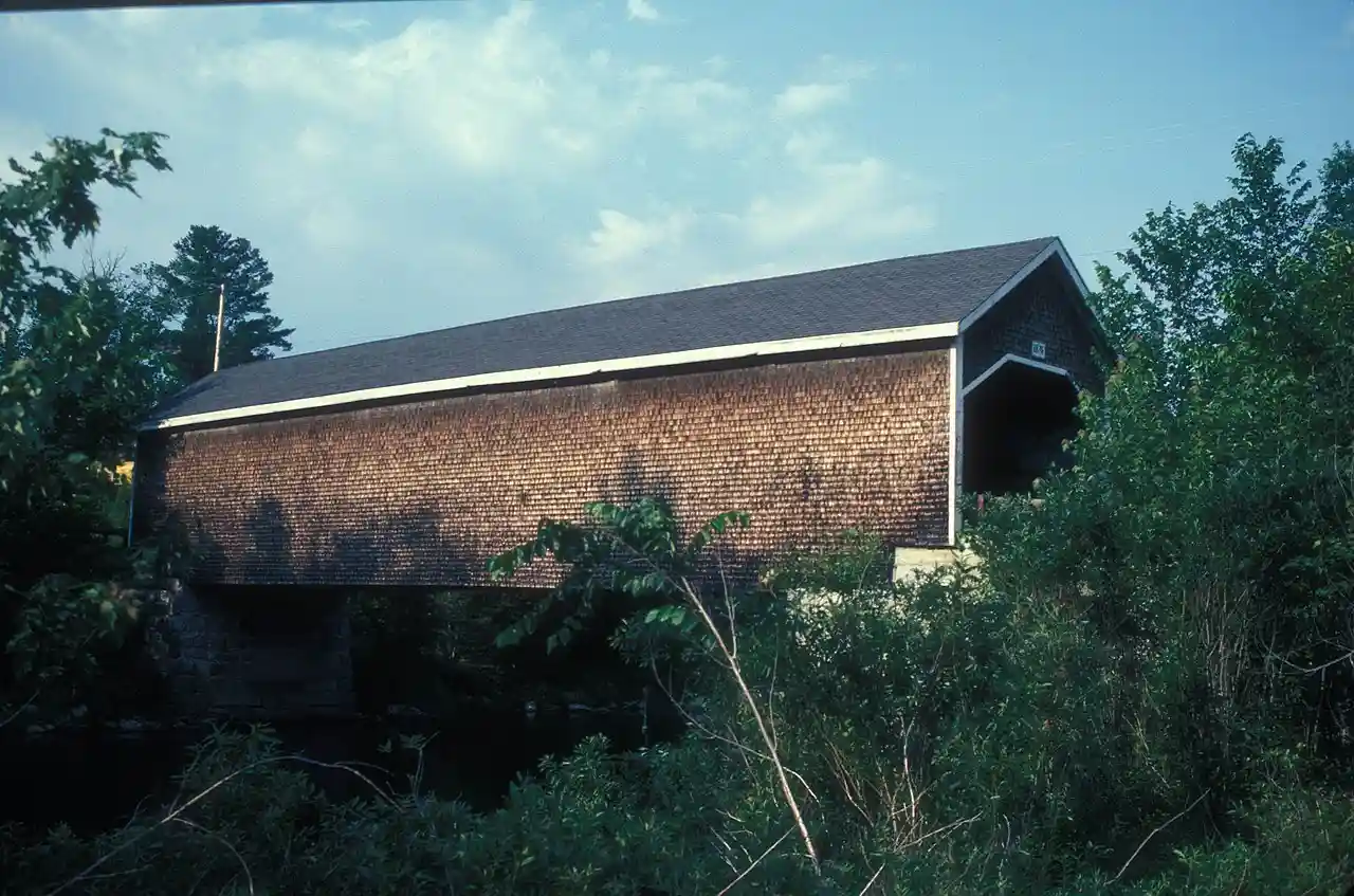 The Robyville Bridge is a historic covered bridge in Corinth, Maine. Built in 1876, this Howe truss bridge is one of the state's few surviving 19th-century covered bridges. It carries Covered Bridge Road across Kenduskeag Stream in the southern part of the rural community. It was listed on the National Register of Historic Places in 1970 and designated as a Maine Historic Civil Engineering Landmark by the American Society of Civil Engineers in 2002. Read more on Wikipedia