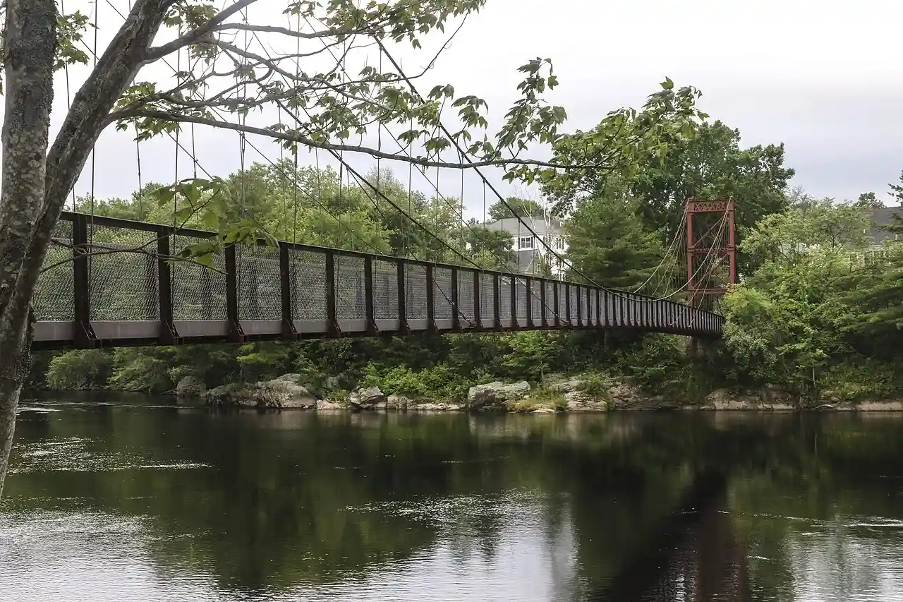 The Androscoggin Swinging Bridge (also known simply as the Swinging Bridge) is a pedestrian suspension bridge spanning the Androscoggin River in Maine between the towns of Topsham in Sagadahoc County and Brunswick in Cumberland County. The bridge was built in 1892 as a timesaving approach for employees of the Cabot Manufacturing Company of Brunswick, could have safer and easier passage across the river. Read more on Wikipedia