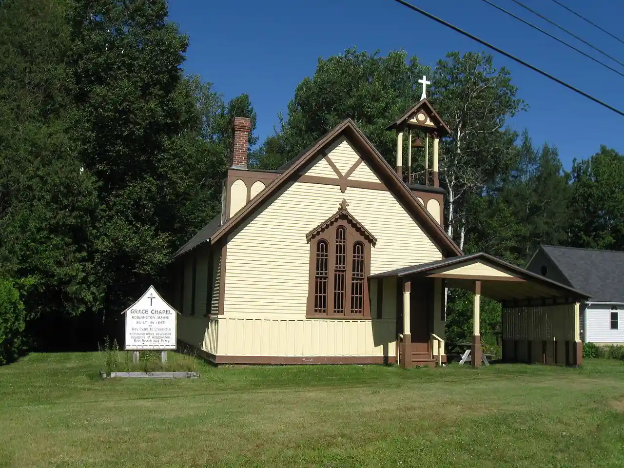 The former Grace Episcopal Church is an historic Episcopal church located on U.S. Route 1 half a mile northwest of its junction with 3rd Street in Robbinston, Maine, in the United States. Built in 1882, it is one of a series of churches along Maine's coast that was funded by summer residents, and is a fine vernacular expression of Carpenter Gothic architecture. It was listed on the National Register of Historic Places in 2001. It is now the museum of the Robbinston Historical Society. Read more on Wikipedia