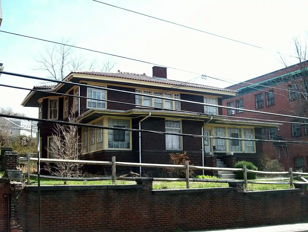 Thomas Koon House is a historic home in Cumberland, Allegany County, Maryland, United States. It is a brick Prairie-style house of large scale built in about 1912. It features arranged rectangular blocks with large expanses of window space, a terra cotta tiled hip roof and a small similarly influenced detached garage. The house was designed by Holmboe & Lafferty of Clarksburg for Doctor Thomas W. Koon, who arrived in Cumberland setting up an "active general practice" in May 1900. Read more on Wikipedia