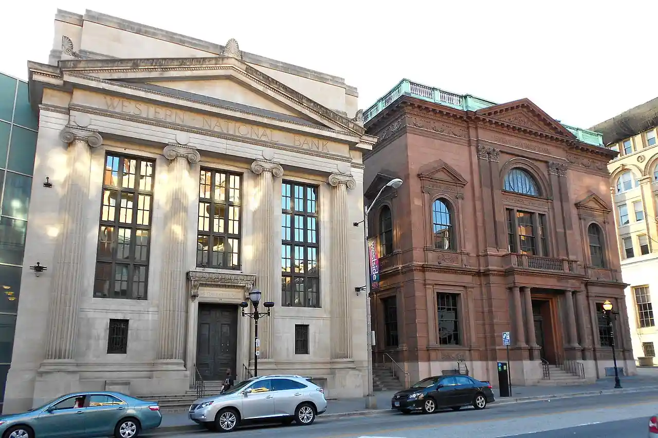 Baltimore Grand is a historic bank building located at Baltimore, Maryland, United States. It occupies two historic bank buildings, the former Western National Bank (1881, remodeled 1912) and the former Eutaw Savings Bank (1887, remodeled 1911), which were connected in 1989 and adaptively reused to create a commercial catering and banquet facility. It features a large arched window above the entrance portico that is framed by paired fluted pilasters with Corinthian capitals extending to the cornice line. Read more on Wikipedia