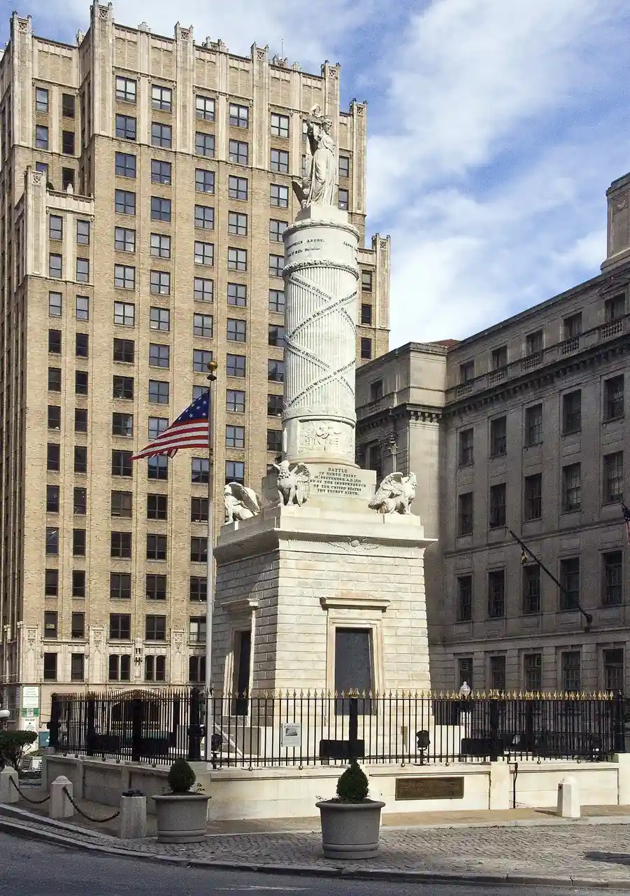 The Battle Monument, located in Battle Monument Square on North Calvert Street between East Fayette and East Lexington Streets in Baltimore, Maryland, commemorates the Battle of Baltimore with the British fleet of the Royal Navy's bombardment of Fort McHenry, the Battle of North Point, southeast of the city in Baltimore County on the Patapsco Neck peninsula, and the stand-off on the eastern siege fortifications along Loudenschlager and Potter's Hills, later called Hampstead Hill, in what is now Patterson Park since 1827, east of town. It honors those who died during the month of September 1814 during the War of 1812. The monument lies in the middle of the street and is between the two Baltimore City Circuit Courthouses that are located on the opposite sides of North Calvert Street. It was sponsored by the City and the "Committee of Vigilance and Safety" led by Mayor Edward Johnson and military commanders: Brig. Gen. John Stricker, Maj. Gen. Samuel Smith and Lt. Col. George Armistead (of Fort McHenry). Read more on Wikipedia