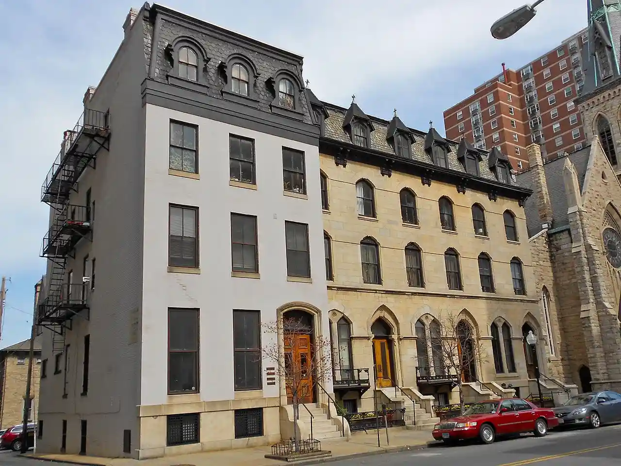 Buildings at 10, 12, 14, and 16 East Chase Street is a historic set of rowhouses located at Baltimore, Maryland, United States. Number 10 is a -story brick townhouse with a 3-bay front façade, fitted with marble facing from ground to first floor level. It is believed to have been designed by Bruce Price and / or E. Francis Baldwin, architects of neighboring Christ Church. Numbers 12, 14, and 16, by contrast, are identical -story, two-bay houses constructed of green serpentine marble with contrasting stone detail. The group dates from between 1870 and 1875. They represent a fine example of the Gothic Revival style as interpreted for domestic architecture. Read more on Wikipedia