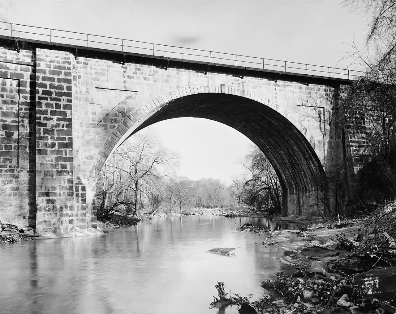 The Carrollton Viaduct, located over the Gwynns Falls stream near Carroll Park in southwest Baltimore, Maryland, is the first stone masonry bridge for railroad use in the United States, built for the Baltimore and Ohio Railroad, founded 1827, and one of the world's oldest railroad bridges still in use for rail traffic. Construction began in 1828 and was completed in 1829. The bridge is named in honor of Charles Carroll of Carrollton (1737–1832), of Maryland, known for being the last surviving signer of the Declaration of Independence, the only Roman Catholic in the Second Continental Congress (1775–1781), and wealthiest man in the Thirteen Colonies of the time of the American Revolutionary War (1775–1783). Read more on Wikipedia