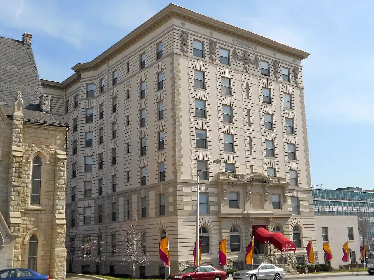 Cecil Apartments is a historic apartment building in Baltimore, Maryland, United States. It is a seven-story building constructed of multiple shades of light-colored brick, accented with limestone and cast terra cotta ornament in the Beaux-Arts style. The structure takes the form of a "T". Constructed in 1902, it was one of the first important apartment buildings in Baltimore, built at the edge of the city's most elite downtown neighborhood, Bolton Hill. It was designed by Baltimore architect Edward Hughes Glidden, and it marked the evolution of elite living that had come to characterize the Bolton Hill neighborhood. Despite the apartments' location often being referred to as Bolton Hill, it is actually within the boundaries of the adjacent Madison Park neighborhood. Read more on Wikipedia