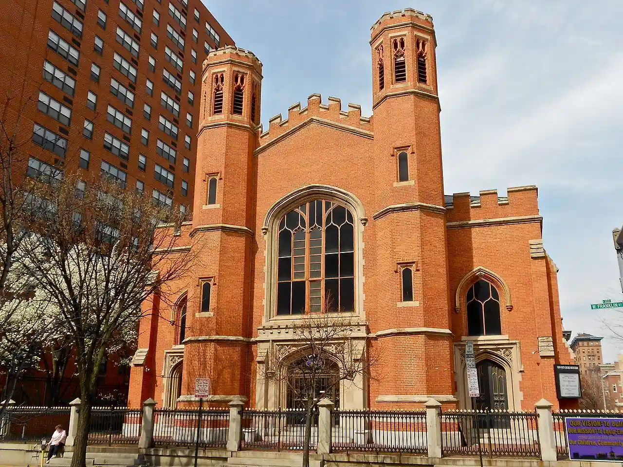 Franklin Street Presbyterian Church and Parsonage is a historic Presbyterian church located at 100 West Franklin Street at Cathedral Street, northwest corner in Baltimore, Maryland, United States. The church is a rectangular Tudor Gothic building dedicated in 1847, with an addition in 1865. The front features two 60 foot flanking octagonal towers are also crenelated and have louvered belfry openings and stained glass Gothic-arched windows. The manse / parsonage at the north end has similar matching walls of brick, heavy Tudor-Gothic window hoods, and battlements atop the roof and was built in 1857. Read more on Wikipedia