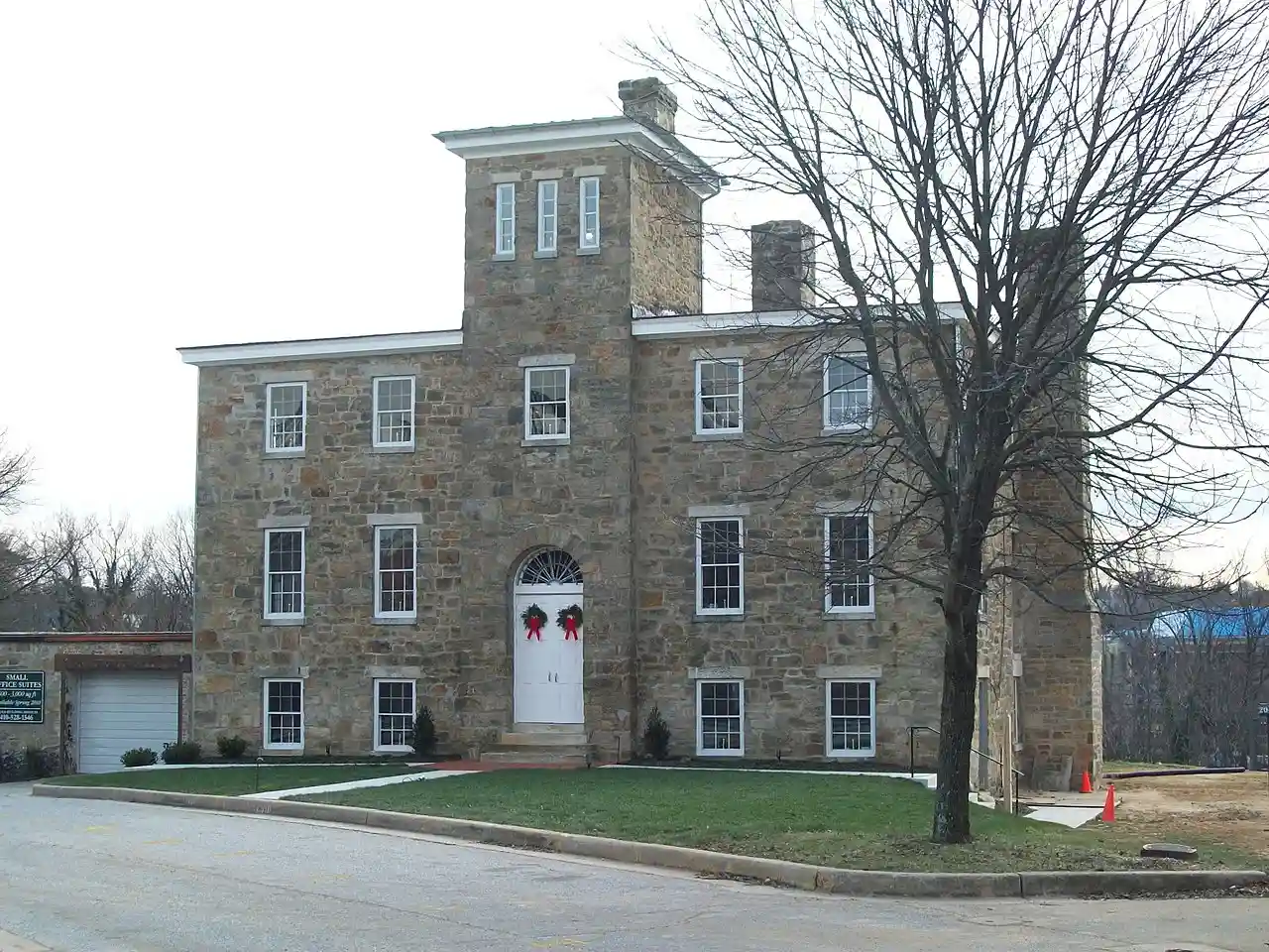 Baltimore County Jail is a historic jail located at Towson in Baltimore County, Maryland, United States. It was built in 1855 and is a two-story Italianate style stone building, measuring 52 feet wide and 62 feet deep. It consists of a five-bay-wide warden’s house with a central three story entry tower. In the rear is a cell block with three levels of jail cells and covered by a gable roof. The warden's house and tower features a low pyramidal hipped roof and walls. Attached to the warden's house is a stone garage built in 1940. It was used as a correctional facility until 2006. Read more on Wikipedia