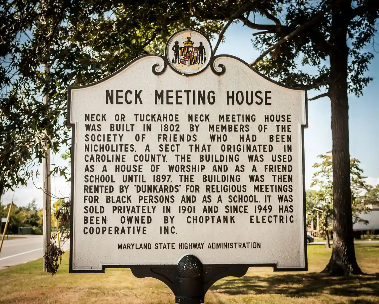 The Neck Meetinghouse and Yard, also known as the Quaker Meetinghouse and Graveyard, is a historic Quaker meetinghouse located at West Denton, Caroline County, Maryland. It is a one-story rectangular frame building with a pitched gable roof measuring 30 feet, 8 inches long and 20 feet, 5 inches deep. In the graveyard are six marked burials with stones dating from the 1850s to 1890, with some more recent interments. It is the only extant Friends meeting house in Caroline County, and one of only a few still standing on the Eastern Shore. The meeting house was utilized from September 26, 1802, when the first meeting was held in the building, until it was abandoned in 1890 for lack of funds and participants. Read more on Wikipedia