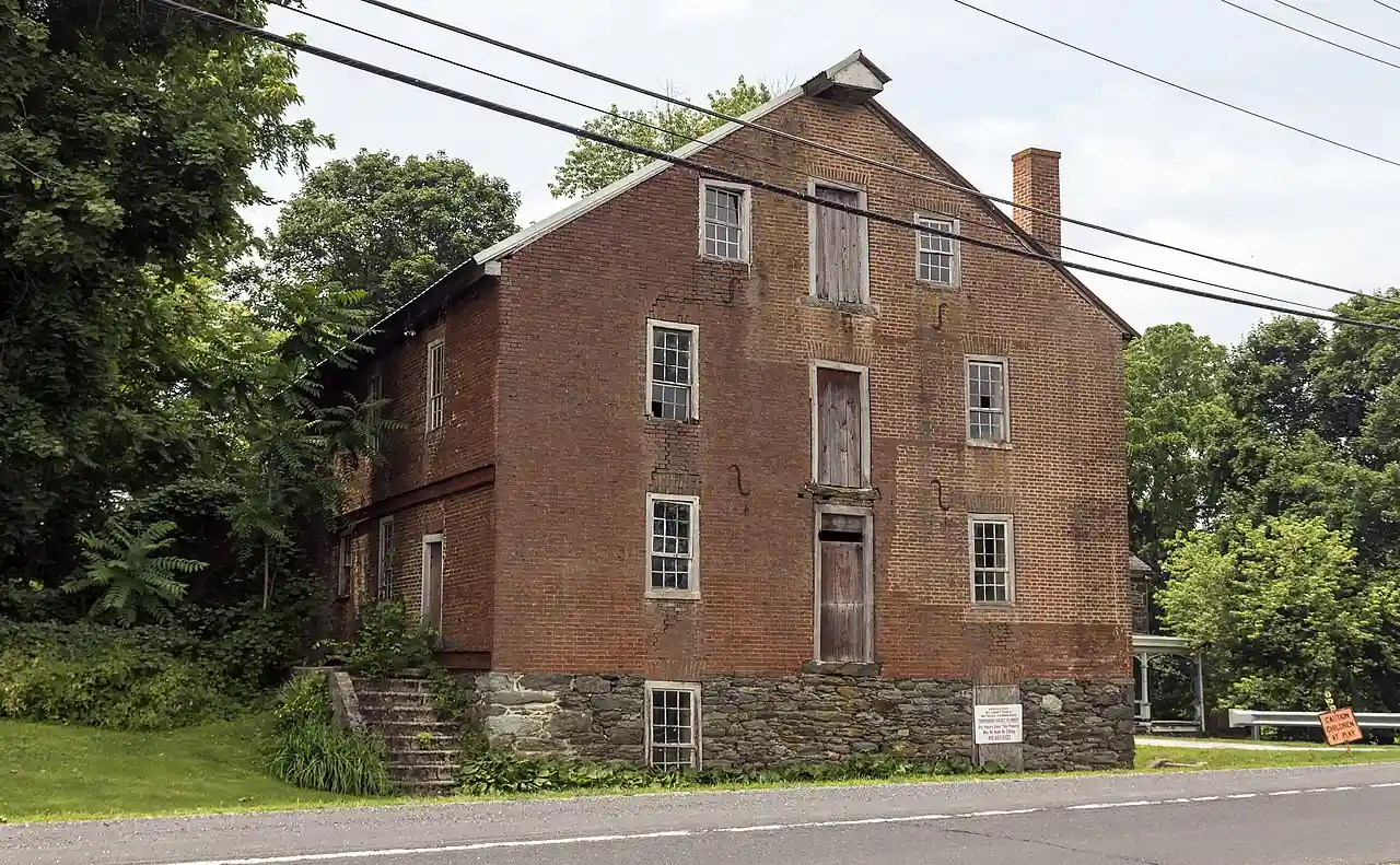 Roop's Mill is a historic grist mill complex located near Westminster, Carroll County, Maryland. The complex includes a three-story, brick and stone mill, dating from about 1795 and rebuilt in 1816; the David Roop House, an 1825 stone dwelling; a log cooper's shed; an early two-part bank barn; numerous farm sheds; a late-19th century iron suspension bridge; and a bank barn dated to the 1860s. The brick mill was constructed according to the designs of Oliver Evans. Read more on Wikipedia