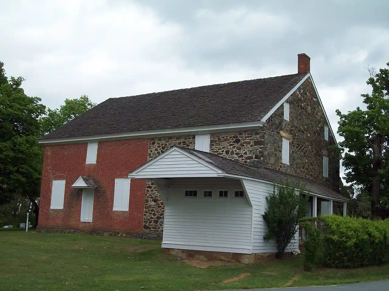 East Nottingham Meetinghouse, or Brick Meetinghouse, is a historic Friends meeting house located at Rising Sun, Cecil County, Maryland. It consists of three different sections: the Flemish bond brick section is the oldest, having been built in 1724, by ; the stone addition containing two one-story meeting rooms on the ground floor, each with a corner fireplace at the south corners of the building, and a large youth gallery on the second floor; and in the mid 19th century, a one-story gable roofed structure was added at the southwest corner of the stone section to serve as a women's cloakroom and privy. It is of significance because of its association with William Penn who granted the site "for a Meeting House and Burial Yard, Forever" near the center of the Nottingham Lots settlement and was at one time the largest Friends meeting house south of Philadelphia. The Philadelphia Half-Yearly Meeting was held here as early as 1725. During the Revolutionary War, an American Army hospital was established here in 1778 for sick and wounded troops under General William Smallwood's command and the Marquis de Lafayette's troops camped in the Meeting House woods on the first night of their march from the Head of Elk to victory at the Battle of Yorktown in 1781. Read more on Wikipedia