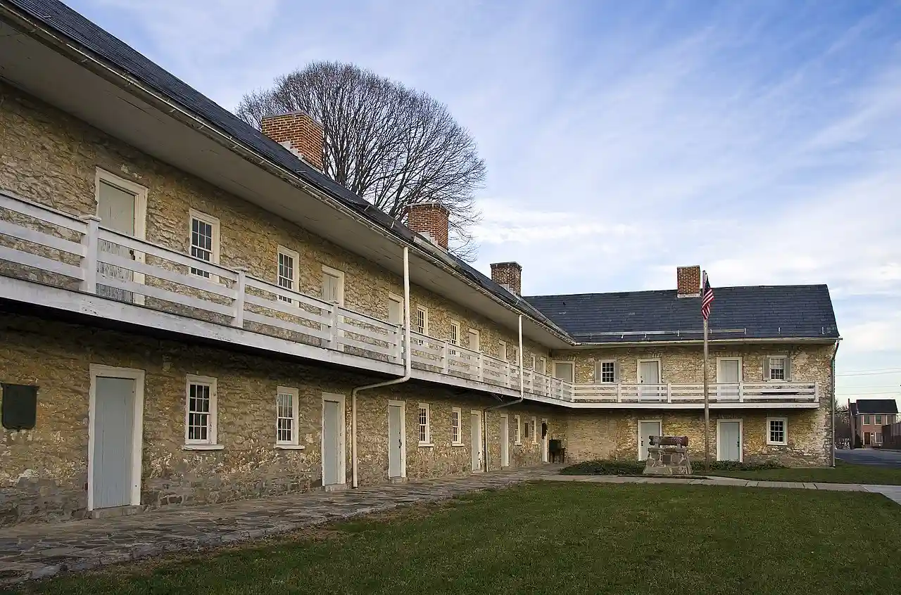 Hessian Barracks, formerly known as Frederick Barracks, is an historic barracks building located in Frederick, Maryland. The State of Maryland contracted to build a barracks in the summer of 1777, but it was not completed until 1781. There were two L-shaped buildings built on the site, but one was demolished in 1871. The building is a two-story stone structure with gallery porches and a gable roof. Hessian Barracks was listed on the National Register of Historic Places in 1971. Read more on Wikipedia