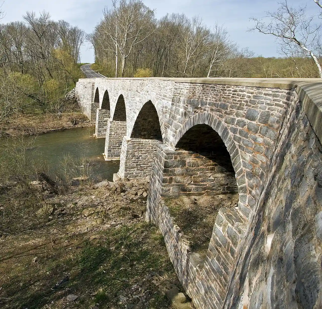 Begun in 1898 in rural Frederick County, Maryland, the LeGore Bridge was completed and opened to the public in 1900. It was built and maintained by the owners of the LeGore Lime Company, including local businessman James William LeGore and his company advisor, Eugene Hammond. It is in length, wide and high. The bridge is situated at 39°35'N 77°19'W. The five arch limestone bridge was restored in 1981 and 2009. Read more on Wikipedia