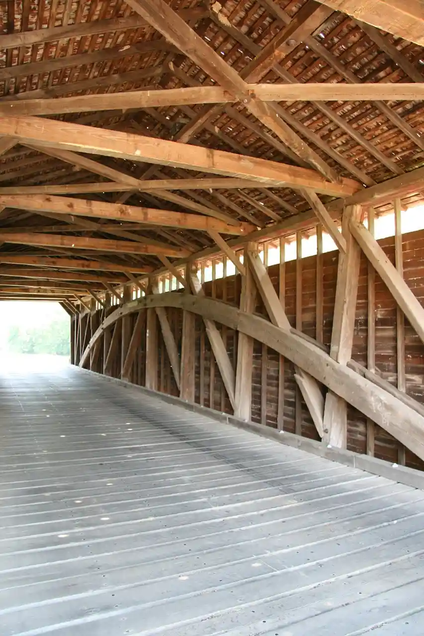 The Utica Road Covered Bridge is a Burr truss wooden covered bridge located near Lewistown, Maryland. Originally built in 1834, it spanned the Monocacy River at the Devilbiss Bridge crossing. An 1889 flood damaged the bridge and the surviving half was moved to Fishing Creek in 1891. Like the nearby Loys Station Covered Bridge, a pier was inserted at the middle of the bridge to halve its span. Read more on Wikipedia