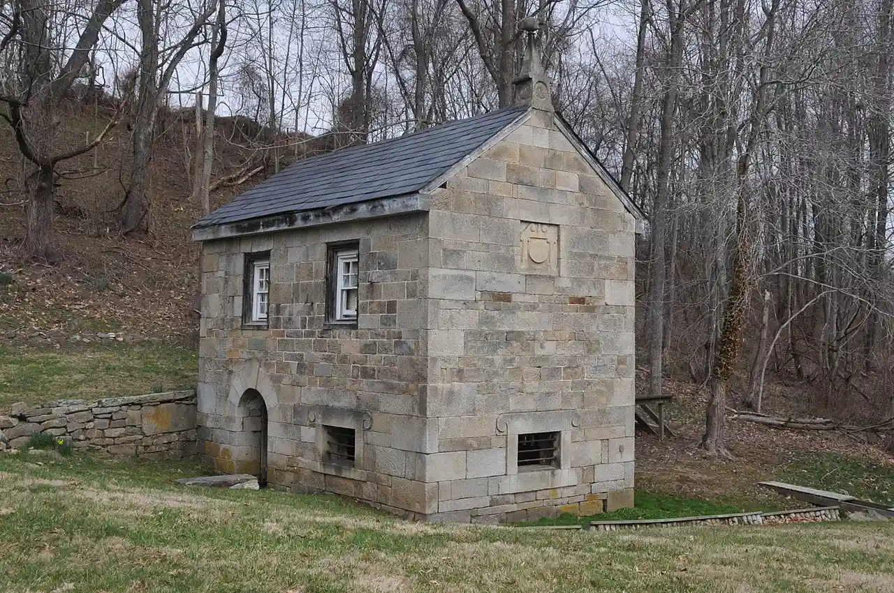 D. H. Springhouse is a historic springhouse located at Bel Air, Harford County, Maryland. It is a little gray stone building set into the base of a steep hill. This is a stone springhouse with a schoolroom above, 16.5 feet by 23 feet, with one narrow wall set into the bank over several fresh springs. It was built about 1816, and the quality of stonemasonry is notable. Read more on Wikipedia