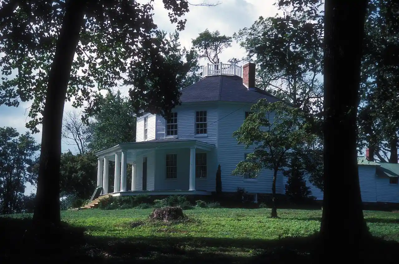 Wildfell is a historic home located at Darlington, Harford County, Maryland, United States. It is a two-story, octagonal house of stacked plank construction, featuring an 8-sided roof topped by an octagonal "captains walk," flanked by two brick chimneys. The house has a simplified Federal style. It was built about 1854, and served as summer home for the Jewett family until 1874. Read more on Wikipedia