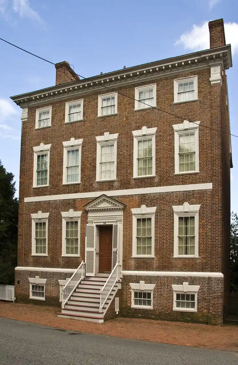 The Denton House, also known as the Denton-Weeks House, the River House, and the Smyth-Letherbury House, is a historic residence at 107 Water Street in Chestertown, Maryland. It is a three-story brick building, with a five-bay front facade framed by corner pilasters with stone capitals. The building has a raised basement, with a stone stringcourse between it and the first floor. The front entrance is centered, with an elaborate surround consisting of pilasters, entablature and dentillated gable. The house was built about 1784 by Richard Smyth, the son of one of the area's wealthiest merchants. In 1791 it was bought by Peregrine Letherbury, the first law professor at Washington College. Read more on Wikipedia