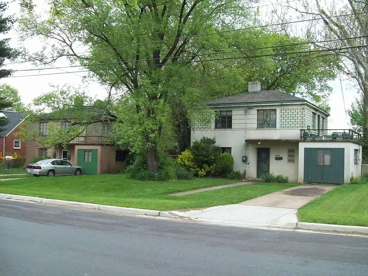 The Polychrome Historic District is a national historic district in the Four Corners neighborhood in Silver Spring, Montgomery County, Maryland. It recognizes a group of five houses built by John Joseph Earley in 1934 and 1935. Earley used precast concrete panels with brightly colored aggregate to produce the polychrome effect, with Art Deco details. The two-inch-thick panels were attached to a conventional wood frame. Earley was interested in the use of mass-production techniques to produce small, inexpensive houses, paralleling Frank Lloyd Wright's Usonian house concepts. Read more on Wikipedia