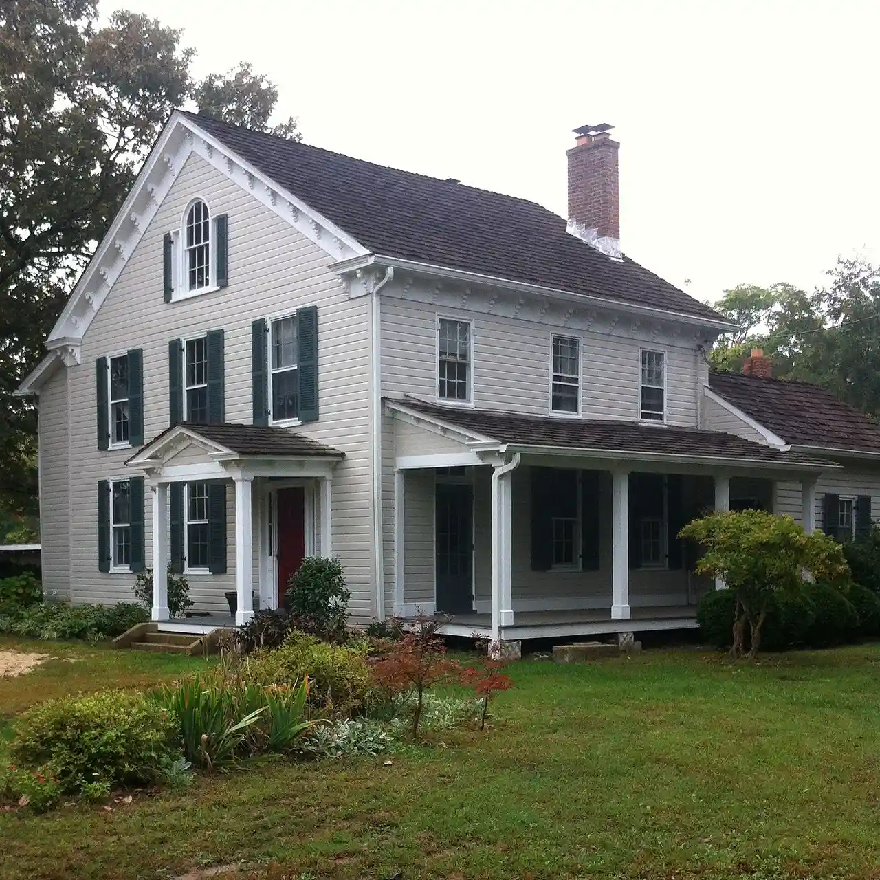 The old St. Mary's Rectory is a gable-front 2-story frame dwelling of three by three bays, built in 1849 and enlarged to twice its size in 1856, and located in Aquasco, Prince George's County, Maryland. The structure is significant for its architecture and for its association with the history of St. Paul's Parish and the community of Aquasco. The rectory is an excellent example of a vernacular building with Greek Revival and Italianate stylistic elements. The floor plan exemplifies a style typical of the dwellings of successful landowners and merchants of the mid-19th century in Prince George's County. Original Greek Revival style elements include the front gable entrance facade, crown molded returned cornice, porch detail, interior stair detail, door and window surrounds, and the parlor mantel. Italianate elements include the heavy bracketing of the exterior cornice and the tripartite window in the north gable end. Read more on Wikipedia
